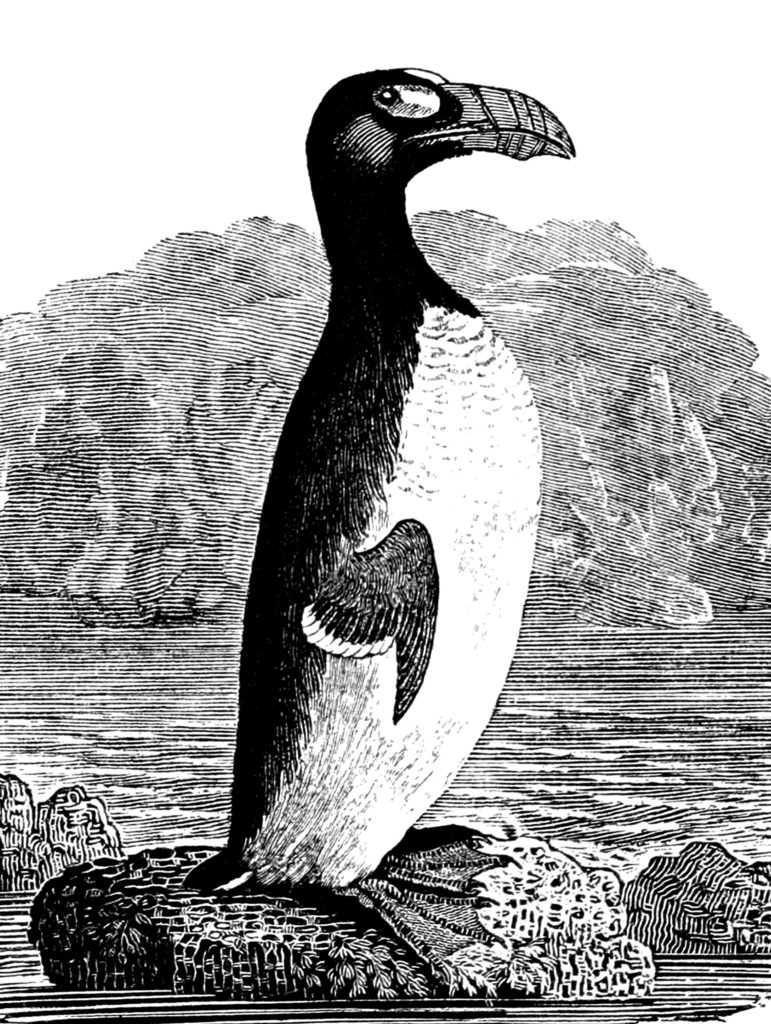 The bird stands at least a foot taller than any of the other birds on the rocky outpost. It’s head and shoulders bolt upright, a prophet in black and white. It’s large razorbill beak, as big as its head. We take it alive, the three of us, we think it will fetch a better price from the collector.
